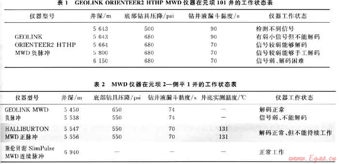 2) 川t東北工區(qū)的實(shí)踐表明:普通的HALLIBURTON MWD儀器的工作環(huán)境溫度不宜超過(guò)130℃;GEOLINK ORIENTEER2 HTHP儀器可適應(yīng)更高的溫度和壓力,但必須要求有足夠的底部鉆具壓降,當(dāng)其應(yīng)用于井深超過(guò)6000m的井時(shí),底部鉆具壓降應(yīng)在800psi以上且鉆井液漏斗黏度不宜大于70s。