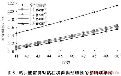 由于鉆井液的存在,鉆柱在進(jìn)行軸向運(yùn)動的時候,受到鉆井液的黏滯作用。根據(jù)鉆井液的流變特性,其密度越高,黏度越大,對鉆柱軸向運(yùn)動的阻礙作用越明顯??梢?,鉆井液會對鉆柱縱向振動的固有頻率產(chǎn)生很大影響,改變縱向振動的臨界轉(zhuǎn)速,這種影響必須引起足夠的重視。