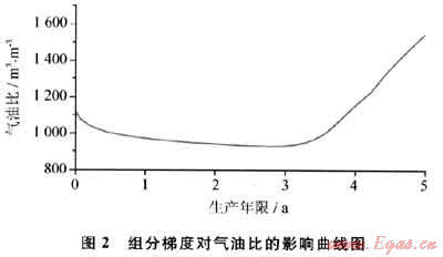 由于重力分離的作用,凝析氣藏在縱向上存在組分梯度,即隨深度的增加,凝析氣藏的組分會(huì)發(fā)生變化,流體變重。而某些凝析氣藏的組分梯度很明顯,如雅克拉和大澇壩凝析氣藏。而在對(duì)氣井進(jìn)行射孔時(shí),為了減小邊、底水的影響,一般選擇對(duì)儲(chǔ)層的上部進(jìn)行射孔,這就造成氣井剛開始生產(chǎn)的凝析氣主要為深度較淺的流體,這些凝析氣相對(duì)于更深的凝析氣來說組分較輕,因此剛開始生產(chǎn)時(shí)的氣油比較高,而隨著開采的繼續(xù),將采出更多的深層較重的凝析氣,這就造成生產(chǎn)氣油比的下降。
