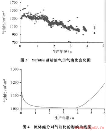 某些凝析氣藏在形成時(shí),由于自然對(duì)流和熱擴(kuò)散的作用[5],導(dǎo)致流體重組分含量隨深度的增加而減小,即氣藏頂部的流體最重,隨深度的增加,重組分含量逐漸減小,如日本的Yufutsu凝析油氣田。該氣田部分直井選擇在儲(chǔ)層的下部進(jìn)行射孔,這就造成剛開始生產(chǎn)時(shí)的流體較輕,氣油比較高,而隨著開采的繼續(xù),將采出更多的淺層較重的凝析氣,這就造成生產(chǎn)氣油比的下降(圖3)。