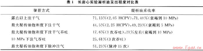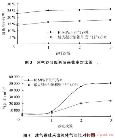 兩種實驗結(jié)果表明凝析油采收率均不高。前者吞吐3次后,凝析油采收率為17.60%,而后者吞吐3次可得凝析油采收率25.61%,這是由于壓力增加蒸發(fā)部分析出凝析油,但壓力下降后馬上又析出,沒有建立驅(qū)動循環(huán),因此采收率低,說明采用單井吞吐效果不好。