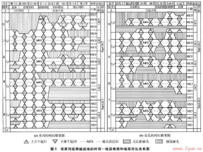 4) 在時間-地層格架中(圖5-a)各超長期、長期旋回的層序界面自西向東,由川西坳陷經(jīng)川中前陸隆起至川東南坳陷具有逐漸加大的上超穿時性,相關(guān)的中期旋回發(fā)育數(shù)量也依次減少,而最大洪泛面具有良好的等時性,洪泛面兩側(cè)的中期旋回均有保存。因此,由最大洪泛期沉積的泥巖段成為區(qū)域地層劃分和等時對比的依據(jù)。