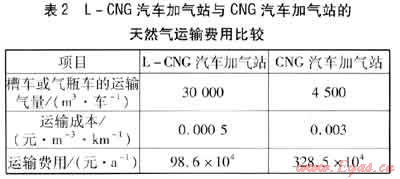 由于加氣站總運(yùn)營費(fèi)用的90%以上是用于購買和運(yùn)輸天然氣,因此從氣源點(diǎn)到加氣站的運(yùn)輸成本對(duì)加氣站的運(yùn)行費(fèi)用產(chǎn)生很大影響,進(jìn)而影響加氣價(jià)格。L-CNG汽車加氣站與CNG汽車加氣站的天然氣運(yùn)輸費(fèi)用比較見表2。