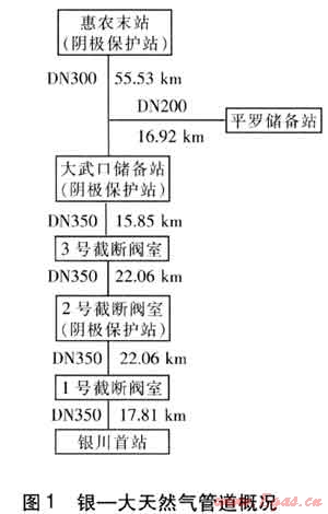 石嘴山市天然氣工程管道(簡(jiǎn)稱銀-大天然氣管道)起點(diǎn)為銀川的銀川首站,在大武口區(qū)和平羅縣分別設(shè)分輸站,末站設(shè)在惠農(nóng)區(qū)的煤氣廠。該管道全長(zhǎng)150.23km,管道規(guī)格分別為DN 350、300、200mm,設(shè)計(jì)年輸氣能力為6×108m3/a。該管道距離較長(zhǎng),采用強(qiáng)制電流陰極保護(hù)。銀-大天然氣工程管道概況見圖1。