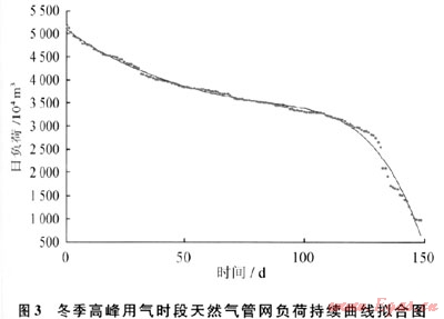 由圖2可知同一地區(qū)的天然氣管網負荷持續(xù)曲線具有相似性,為了研究極端天氣條件下的天然氣管網負荷特性,現取北京市2009年4月1日至2010年3月31日的天然氣管網負荷持續(xù)曲線,將夏季負荷截去后,留下冬季高峰用氣時段150d的負荷曲線,如圖3所示。對圖3中散點進行數值擬合得到擬合多項式[6]: