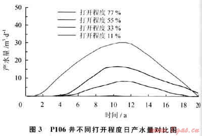 數(shù)值模擬研究結(jié)果表明:當(dāng)打開11%時,由于氣層上部位置主要為Ⅲ類儲層,物性差,氣井生產(chǎn)基本不見水,但穩(wěn)產(chǎn)期不足3a。當(dāng)打開33%、55%、77%時,見水時間分別為5.2a、3.5a、1.4a,無水期采出程度分別為15.1%、8.8%、6.2%;當(dāng)打開程度大于77%時,由于氣層中、下部位置多為Ⅱ類儲層,且局部發(fā)育裂縫,儲層物性較好,開發(fā)過程中邊水將快速推進(jìn)??梢姡S著P106井氣層打開程度的不斷增加,無水采氣期將逐漸縮短,相應(yīng)的無水期采出程度將逐步降低,而穩(wěn)產(chǎn)期因多因素影響將發(fā)生由低到高然后降低的變化。由此認(rèn)為,P106井氣層自上而下打開程度控制在55%左右為最優(yōu)[6](圖3)。
