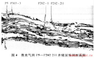 普光氣田目前已完鉆6口水平井,鉆遇氣層厚度介于398.6~623.5m之間,均達(dá)到或超過設(shè)計(jì)指標(biāo)。如P202-2H井,原為部署在P202井臺(tái)上的1口定向井,根據(jù)該井臺(tái)上P202-1井(直井)實(shí)施情況及儲(chǔ)層預(yù)測(cè)結(jié)果(圖4),該井區(qū)氣層厚度介于120~150m,且縱向上分布比較集中,適合打水平井,因而重新進(jìn)行了井型優(yōu)化。該井設(shè)計(jì)水平段長(zhǎng)470m,鉆遇氣層厚度602m,比設(shè)計(jì)為斜井多鉆氣層400m。2009年5月,該井投產(chǎn)試氣,射開氣層558m,測(cè)試無阻流量686×104m3/d。