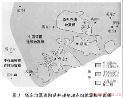 通過地震標定表明,卻爾卻克組深水盆地相沉積以中強振幅、中等連續(xù)地震相為特征,濁積相以雜亂充填地震相為主要特征。地震相追蹤發(fā)現(圖3),東南部的塔東1~塔東2井區(qū)以雜亂充填地震相為主,烴源巖不發(fā)育,與鉆井吻合。東部的米蘭1、羅西1井區(qū)中強振幅、中等連續(xù)地震相發(fā)育,烴源巖厚度大。近期鉆探的古城4井卻爾卻克組為斜坡 盆地沉積[12],缺少濁積砂巖,為中強振幅較連續(xù)地震相,鉆探證實也有較好的烴源巖發(fā)育。