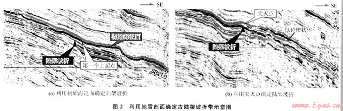 2) 確定低位楔狀體的尖滅點(diǎn):地震剖面上,層序界面之上的第一個(gè)上超點(diǎn)較難找到,但有些地方低位楔狀體的尖滅點(diǎn)非常清晰,可將此點(diǎn)作為陸架坡折點(diǎn)(圖2-b)。