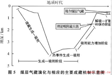煤層氣成藏演化伴隨著煤層的沉積、埋藏變質(zhì)和抬升的演化過程。我國除變質(zhì)程度較低的含煤盆地外,絕大多數(shù)含煤盆地都經(jīng)歷了沉降和回返抬升演化階段,有的盆地甚至經(jīng)歷了多次的旋回。煤層的埋藏-抬升決定了煤層氣的成藏演化經(jīng)歷生成和吸附、吸附能力增加和解吸、擴(kuò)散、保存階段(圖5)。保存條件是控制現(xiàn)今煤層氣富集的關(guān)鍵,現(xiàn)今煤層氣藏的形成取決于構(gòu)造控藏關(guān)鍵時(shí)刻。這一關(guān)鍵時(shí)刻不等同于常規(guī)天然氣成藏的關(guān)鍵時(shí)刻,它是指地質(zhì)歷史時(shí)期煤層生烴終止后具有最小埋藏深度的時(shí)間。