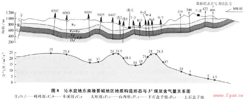 5) 在成藏機(jī)制上,煤層氣的聚集受水勢和壓力的控制,往往具有向斜富集的特征;常規(guī)天然氣聚集受氣勢的控制,往往具有背斜或高部位富集的特征。