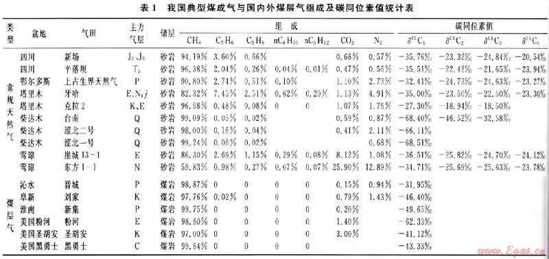 2) 在地球化學(xué)成分上,煤層氣與常規(guī)天然氣的主要差別在于煤層氣組分較為簡單,以甲烷為主,重?zé)N氣和非烴氣含量較少,為干氣或特干氣,甲烷碳同位素值偏輕;而常規(guī)天然氣成分相對復(fù)雜,甲烷含量變化較大,重?zé)N氣也相對較多,甲烷碳同位素值偏重。