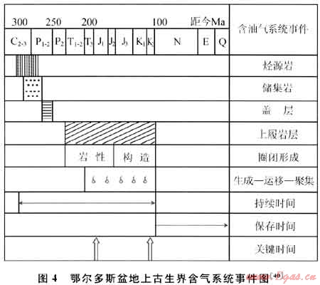常規(guī)天然氣的成藏演化過程一般經(jīng)歷3個(gè)階段:生成階段、運(yùn)移和聚集階段、保存和破壞階段。氣藏演化不一定經(jīng)歷晚期抬升過程,烴源巖、儲層和蓋層等靜態(tài)要素和天然氣生成、運(yùn)移、圈閉形成和成藏等過程的動(dòng)態(tài)地質(zhì)作用的最佳時(shí)空匹配是其成藏的關(guān)鍵。如鄂爾多斯盆地上古生界天然氣成藏要素及地質(zhì)作用的最佳匹配時(shí)間(關(guān)鍵時(shí)刻)是早侏羅世和晚白堊世[40](圖4)。