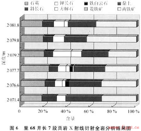 長7段野外露頭樣品脆性礦物石英與斜長石含量高,黏土含量低。位于陜西省銅川市金鎖關鎮(zhèn)何家坊的長7段黑色頁巖X射線衍射全巖分析結(jié)果顯示:石英含量為42.92%~47.18%,斜長石含量為5.52%~9.06%,鉀長石含量為6.07%~18.06%,黏土含量為24.41%~31.01%,方解石、鐵白云石、菱鐵礦含量沒有或很少。宜川三里灣露頭樣品石英含量比銅川金鎖關鎮(zhèn)何家坊野外露頭樣品低,但斜長石含量要高得多,脆性礦物石英加斜長石含量相當,黏土含量也較低。里68井的巖心分析資料表明:石英含量為17.00%~23.O0%,斜長石含量為5.O0%~10.00%,鉀長石含量為6.00%~15.00%,黏土含量為20.00%~30.O0%,方解石、鐵白云石、菱鐵礦含量沒有或較少(圖6)。巖心樣品除石英含量偏低外,其余礦物含量與露頭樣品接近。