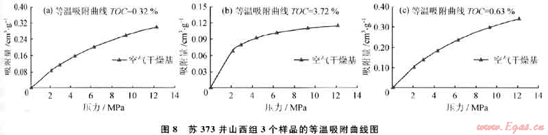 分析蘇373井3個樣品的等溫吸附曲線(圖8)可知:砂質(zhì)泥巖比碳質(zhì)泥巖的甲烷吸附能力強,而同種巖性,TOC與甲烷吸附能力成正比,如T0C為0.6 3%的樣品在壓力為6MPa時,甲烷吸附能力為0.23g/cm3,壓力增加到12MPa時,甲烷吸附能力增至0.34g/cm3。