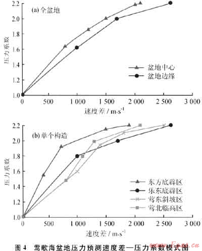 從鶯歌海盆地構(gòu)造格局的角度考慮(圖4-a),可以看到對于同樣的壓力系數(shù)而言,盆地中心的速度差要低于盆地邊緣。究其原因,主要是由于盆地中心處于沉積物快速沉積區(qū),泥巖處于一種欠壓實的狀態(tài),而盆地邊緣處于沉積物路過區(qū),而且同樣深度位置盆地邊緣地層的年代要比盆地中心的地層年代老,地層速度較高。