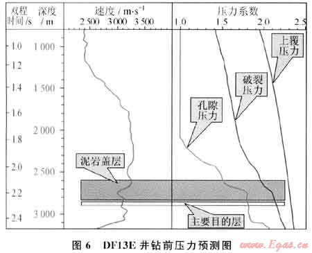 對東方1-1三維地震資料進行精細研究[18~19],在東方氣田西翼發(fā)現(xiàn)黃流組一段大型三角洲體系,落實一群巖性圈閉,經(jīng)過反復(fù)研究和論證,鉆探DF13E井(圖5),該井鉆探目的為探索黃流組一段上部砂體含油氣性和儲量規(guī)模;獲取東方1-1構(gòu)造西塊中層的儲層物性、油氣層流體性質(zhì)及產(chǎn)能資料。該井鉆遇的蓋層與DF11C井和DF11D井的明顯不同,該井位于東方底辟構(gòu)造西側(cè)、底辟背斜之外,鉆探結(jié)果在黃流組一段上部揭示了一套厚達220m的海侵-高位體系域淺海泥巖蓋層,這套直接蓋層不僅厚度大,而且泥巖純,塑性強(可鉆性差),受壓實程度較高,分布范圍較廣,具有超壓(壓力系數(shù)為1.5~1.8)(圖6),表現(xiàn)出良好的高壓封蓋性能,為異常高壓氣藏的形成提供了重要保障。