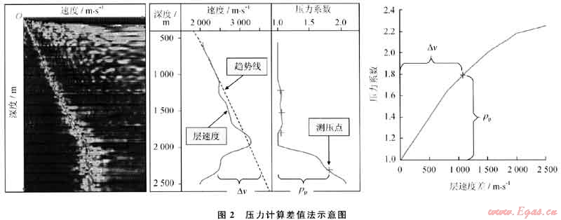 目前地層壓力預(yù)測的方法較多,但大多數(shù)都屬于經(jīng)驗公式的方法,受到一定的適用條件的限制。地層速度是用于地層壓力鉆前預(yù)測和鉆后壓力計算的主要參數(shù),層速度特點是在正常壓實的地層中其值隨深度的增大而增大,而在異常超壓地層中其值比正常值小,因此可憑借層速度的異常變化來判斷和檢測異常高壓地層[7~1O]。經(jīng)過多年對鶯歌海盆地壓力預(yù)測及計算方法研究,發(fā)現(xiàn)“差值法”(圖2)可以應(yīng)用于鶯歌海盆地壓力計算,其基本原理是用速度異常量來確定異常壓力。其標準為:△v=0為正常壓實地層;△v<0為異常高壓力地層。該方法需要在地區(qū)性的壓力預(yù)測數(shù)學(xué)模型的基礎(chǔ)上定量地計算出孔隙壓力,其優(yōu)點是不需要先計算上覆壓力,減少誤差和一些不可控因素。對于這一方法而言,速度差與壓力系數(shù)對應(yīng)的壓力預(yù)測模型的確定是其中的難點和重點。