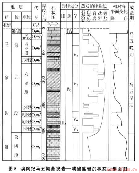 1) 海侵沉積期后的環(huán)境變化:從盆地沉積演化序列來分析,在馬五5沉積后進入馬五4沉積期,沉積環(huán)境發(fā)生了較大的變化,海平面開始相對下降,又進入了蒸發(fā)巖沉積期;在盆地東部鹽洼形成蒸發(fā)巖沉積,在靖邊及靖西則形成盆緣石膏沉積及含膏云坪相的膏云巖沉積。