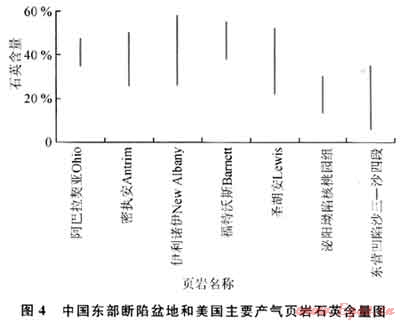與美國主要產頁巖氣盆地類比,中國陸相頁巖具有分布局限、埋藏普遍較深、脆性礦物含量低、黏土含量高(圖4),具有成藏機理和成藏條件特殊以及不利于后期改造等不利因素,需要在今后的工作中,加強陸相頁巖油氣地質理論和開采技術的研究。