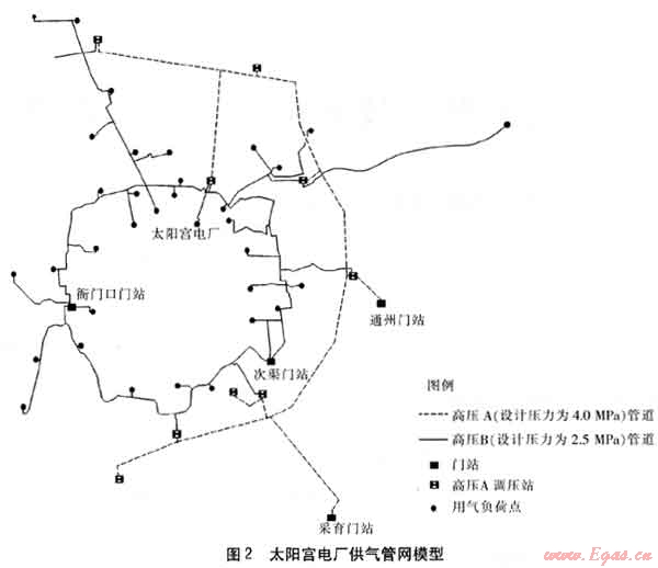 計(jì)算時(shí),作為太陽宮電廠供氣氣源的上游高壓A調(diào)壓站的約束條件為最大出口壓力2.5MPa,其他邊界條件為:整個(gè)管網(wǎng)的負(fù)荷為2010年的負(fù)荷,全網(wǎng)高峰小時(shí)流量為250×104m3/h,電廠高峰小時(shí)流量為16×104m3/h。設(shè)置衙門口門站輸氣能力為50×104m3/h,次渠門站輸氣能力為40×104m3/h,采育門站輸氣能力為80×104m3/h,通州門站輸氣能力為80×104m3/h。