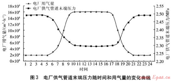 圖3的壓力變化曲線可以清楚地表明電廠運(yùn)行的各時(shí)間段進(jìn)氣管道末端壓力的變化,該壓力變化曲線圖為工程前期制定電廠供氣管道方案提供了重要的參考依據(jù)。