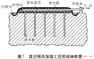 在采用真空預(yù)壓加固軟土地基時(shí),在密封膜上不施加重物,而把大氣作為荷載。在抽氣時(shí),土體孔隙中的氣體首先被抽出,使密封膜緊貼于砂墊層上。砂墊層中形成的負(fù)壓,通過(guò)排水板逐漸向下延伸,并由排水板向其周圍土體傳遞,引起土體中孔隙水壓力降低,從而使土體孔隙中的水由土體向排水板滲流,最后匯至砂墊層中被射流泵排出。淺層真空預(yù)壓加固與深層真空預(yù)壓加固工藝的主要區(qū)別在于,前者采用編織布、無(wú)紡?fù)凉げ嫉忍娲皦|層,以及排水濾管的布置方式不同。真空預(yù)壓加固工藝的現(xiàn)場(chǎng)布置見(jiàn)圖1。