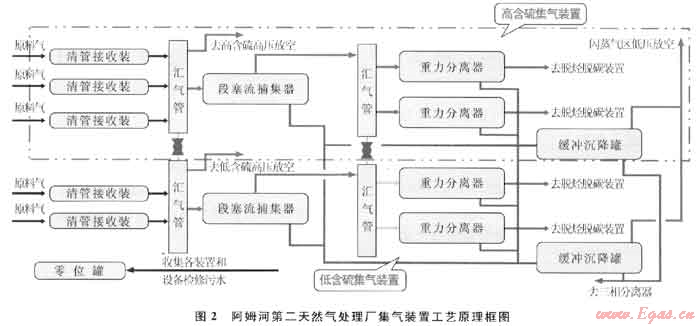 阿姆河第二天然氣處理廠集氣裝置按原料氣中硫化氫含量的高低,設(shè)置了兩套既獨立又聯(lián)通的天然氣處理系統(tǒng),分別與天然氣處理廠下游的酸氣處理系統(tǒng)對應(yīng),最大限度地滿足土庫曼斯坦當(dāng)?shù)貙Νh(huán)保的要求。