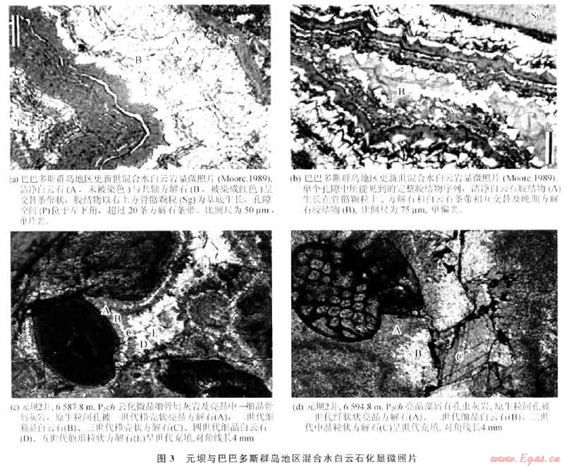 通過對比分析巴巴多斯群島更新世碳酸鹽巖混合水白云石化的情況(圖3~a,b)[5],發(fā)現(xiàn)元壩地區(qū)長興組生屑灰?guī)r混合水白云石化(圖3-c,d)與其有很大的相似性:①白云石膠結(jié)物的量較低并且分布不連續(xù);②白云石膠結(jié)物經(jīng)常作為幾個不連續(xù)的透明白云石膠結(jié)物帶出現(xiàn),且被夾于透明方解石膠結(jié)物之間;③白云石干凈、明亮,方解石膠結(jié)物晶體形態(tài)從纖狀、粒狀、粉晶、中晶、巨晶不等,各期次膠結(jié)特征是晶體依次增大;④沉淀白云石膠結(jié)物的水體有很寬的組分范圍,根據(jù)電子探針對長興組白云巖微量元素分析,Sr0、Na20、K2O表現(xiàn)為較低值,說明大部分白云石形成有淡水的加入[6](表1)。