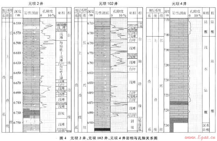 如元壩2井、元壩101井、元壩102井均在長興組頂部發(fā)育了一套局限渴湖沉積環(huán)境中的同生期混合水白云巖,其下部地層溶蝕作用較強(qiáng),溶蝕孔隙發(fā)育,測井解釋的孔隙度為4%~12%(圖4),形成了一套較好的儲層,測試獲得高產(chǎn)天然氣硫。而元壩4井,由于在長興組頂部未發(fā)育該套白云巖,其下部溶蝕作用弱,溶蝕孔隙不發(fā)育,測井解釋的孔隙度小于2%(圖4),未鉆遇儲層。