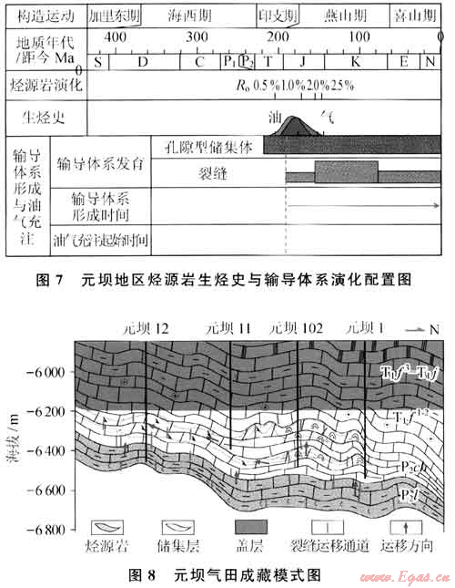 晚印支期,上二疊統(tǒng)龍?zhí)督M烴源巖進(jìn)入生油門限,此時(shí)元壩地區(qū)構(gòu)造活動(dòng)微弱,沒有形成油氣垂向運(yùn)移通道。早燕山期,龍?zhí)督M烴源巖進(jìn)入生油高峰早期,受盆緣造山作用擠壓影響,該區(qū)發(fā)育了構(gòu)造節(jié)理,垂向上溝通龍?zhí)督M源巖,長興組礁灘相儲(chǔ)層與裂縫構(gòu)成油氣垂向輸導(dǎo)與側(cè)向匯聚的輸導(dǎo)體系,使得原油得以在長興組聚集形成巖性油藏(圖7、8)。中燕山期(距今約150Ma)以來,受盆緣造山作用的影響,該區(qū)進(jìn)一步沉降,古油藏深埋,儲(chǔ)層溫度超過160℃,原油開始大量裂解形成氣藏。此期間,上二疊統(tǒng)烴源巖進(jìn)入生氣階段,層間構(gòu)造節(jié)理進(jìn)一步發(fā)育,與儲(chǔ)集體側(cè)向輸導(dǎo)通道一起構(gòu)成輸導(dǎo)體系,繼續(xù)為烴源巖生成的天然氣提供垂向輸導(dǎo)通道。晚燕山期以來,受米倉山和大巴山造山運(yùn)動(dòng)的影響,元壩地區(qū)地層產(chǎn)狀發(fā)生了小幅度的變化。由于元壩地區(qū)飛三段至雷口坡組發(fā)育數(shù)百米厚的膏巖蓋層,形成了區(qū)域性優(yōu)質(zhì)蓋層,為天然氣保存提供了保障。因此,適時(shí)的裂縫發(fā)育、大面積發(fā)育的礁灘相白云巖儲(chǔ)層與烴源巖生烴高峰的有效匹配是氣藏形成的關(guān)鍵。