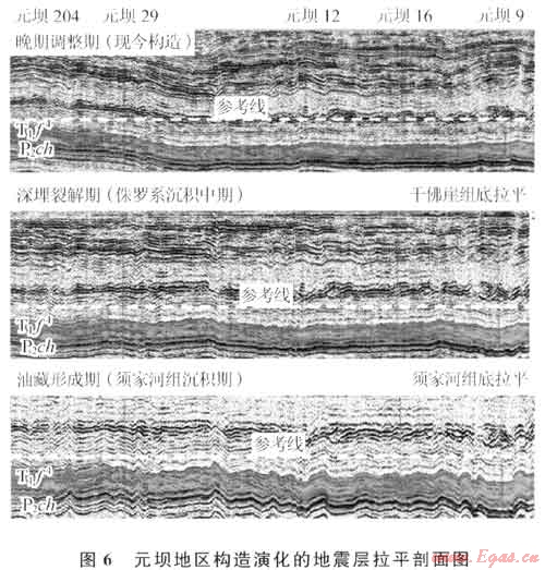 早侏羅世沉積末,長興組埋深超過5000m,烴源巖進(jìn)入生油高峰,中晚侏羅世沉積時(shí)期,從生油高峰向古油藏裂解為氣藏轉(zhuǎn)化。區(qū)域地質(zhì)研究成果表明,大巴山、米倉山的隆起與褶皺時(shí)期也在晚侏羅世末期,而向盆地內(nèi)的遞進(jìn)變形應(yīng)該在稍晚的早白堊世,利用地震資料層拉平技術(shù)證明了這一點(diǎn)(圖6),元壩9井古油水界面深于現(xiàn)今氣水界面也證明了這一點(diǎn)。雖然整個(gè)元壩探區(qū)構(gòu)造變形較弱,但巖心和成像測(cè)井資料顯示,長興組儲(chǔ)層發(fā)育中一高角度裂縫,多口井巖心都見到未有充填物的裂縫發(fā)育,地震剖面上逆斷層一般發(fā)育在下三疊統(tǒng)嘉陵江組至下侏羅統(tǒng)自流井組,而中侏羅統(tǒng)千佛巖組以上常見正斷層發(fā)育。因此,可以得出結(jié)論,印支晚期-燕山早期的構(gòu)造運(yùn)動(dòng)控制了古油藏的形成,由于烴源巖分布面積大、位于儲(chǔ)層附近,古油藏的分布范圍大于今氣藏;中晚燕山運(yùn)動(dòng)以來,隨著龍門山、米倉山、大巴山對(duì)盆內(nèi)的持續(xù)擠壓,構(gòu)造分異更加明顯,九龍山背斜基本定型;原油裂解和深埋高溫導(dǎo)致的硫酸鹽熱化學(xué)還原作用(TSR)形成的酸性流體以及構(gòu)造作用產(chǎn)生的大量裂縫不僅促進(jìn)了埋藏溶蝕作用的發(fā)生和優(yōu)質(zhì)儲(chǔ)層的形成,也促進(jìn)了氣藏的調(diào)整與富集。