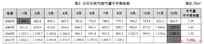 表2是我公司2008年以來(lái)4年的每個(gè)月份天然氣購(gòu)氣量數(shù)據(jù)。其中:藍(lán)色是當(dāng)年最高月份購(gòu)氣量,黃色是當(dāng)年最低月份購(gòu)氣量,最后一列是“公司年度天然氣購(gòu)氣量不平衡系數(shù)”。