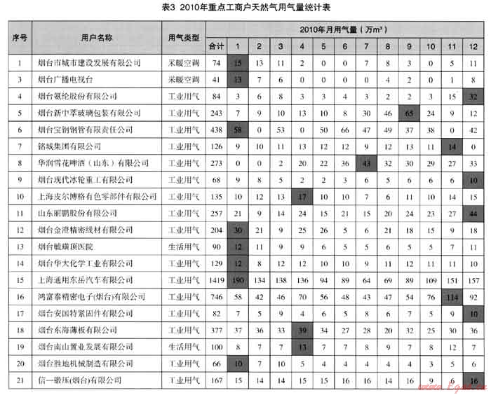 見(jiàn)表3“2010年重點(diǎn)工商戶(hù)天然氣用氣量統(tǒng)計(jì)表”。表中:藍(lán)色是年度最高月份用氣量,黃色是年度最低月份用氣量。工商戶(hù)最高月用氣量主要集中于1月份及12月份,這些月份正是公司供氣高峰時(shí)期。工商戶(hù)最低月用氣量主要集中于7、8月份,而這些月份正是公司供氣量較低的時(shí)間,上述兩個(gè)時(shí)間段直接決定了公司氣量不平衡系數(shù)的大小。多數(shù)工商戶(hù)在公司供氣高峰時(shí)也處于供氣高峰期,對(duì)公司總氣量不平衡的影響是負(fù)面的,我們稱(chēng)之為負(fù)面影響氣量用戶(hù)。