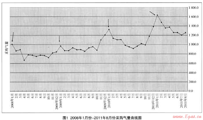 表1 2008年1月至2011年8月天然氣采購(gòu)氣量表    單位:萬(wàn)m3