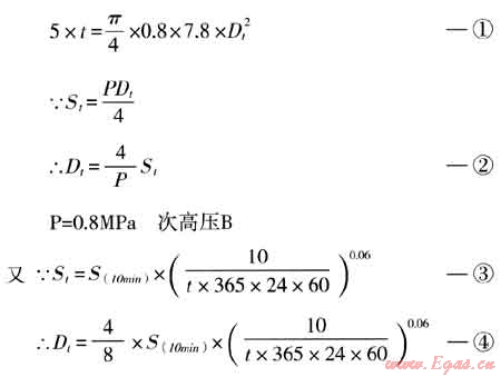 在原管道強(qiáng)度校核始終處于合格范圍的前提下,翻轉(zhuǎn)內(nèi)襯修復(fù)后管道的安全運(yùn)行壽命取決于內(nèi)襯材料封堵體積型缺陷的失效時(shí)間,既當(dāng)內(nèi)襯材料由內(nèi)向外封堵了一個(gè)腐蝕點(diǎn),該點(diǎn)從“虧肉”發(fā)展到較大穿孔,最終發(fā)展到內(nèi)襯材料在內(nèi)壓作用下無(wú)法封堵該孔洞而破裂,這時(shí)的腐蝕孔洞叫臨界孔洞。產(chǎn)生這種失效則修復(fù)后管道運(yùn)行壽命終止。產(chǎn)生臨界孔洞時(shí)間與內(nèi)襯材料性能強(qiáng)度的衰減失效時(shí)間的交叉點(diǎn)就是修復(fù)后管道安全運(yùn)行壽命的終點(diǎn)。