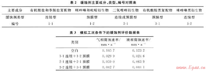 針對國外高含硫氣田已成熟應用的商業(yè)產品,結合普光氣田濕氣集輸工藝的腐蝕特點,選取了連續(xù)型和預膜型2種類型緩蝕劑。根據緩蝕劑在高含硫介質條件下的成膜特性,優(yōu)選了有機胺鹽和季胺鹽復配物、咪唑啉和吡啶衍生物、二氫噻唑衍生物、有機酰胺類復配物、咪唑啉類衍生物共5類緩蝕劑產品,具體類型見表2。