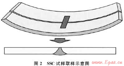 硫化物應力開裂(SSC)試件尺寸:115×15×5(5為壁厚方向)(mm),焊接接頭試樣垂直于焊縫取樣,焊縫位于試樣中部。對于焊接管,應從焊縫、沿焊縫90°、180°部位取樣。以內壁為基準取5mm厚的試樣,圖2為SSC試件取樣示意圖。