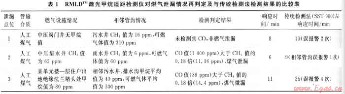 當(dāng)車(chē)載式0MDTM光學(xué)甲烷探測(cè)儀甲烷值超標(biāo)報(bào)警后(設(shè)定為20ppm),可用RMLDTM激光甲烷遙距檢測(cè)儀檢測(cè)在報(bào)警30m范圍內(nèi)的燃?xì)庠O(shè)施和相鄰管溝的CH4值,確定泄漏源,調(diào)頻后再檢測(cè)C0值(無(wú)管溝不需檢測(cè)),若C0值大于CH4值的0.18倍,則可判定為煤氣泄漏所致。表1是對(duì)該城市1條在役管線及支線用RMLDTM檢測(cè)儀進(jìn)行的燃?xì)庑孤┣闆r再判定及與傳統(tǒng)檢測(cè)法檢測(cè)結(jié)果的比較表。