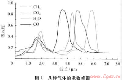 每種氣體都有自己的特征紅外吸收頻率,不受其他氣體吸收峰的干擾,吸收的能量與氣體在紅外光區(qū)內(nèi)的濃度有關(guān),大部分光學(xué)甲烷檢測(cè)儀就是據(jù)此來(lái)進(jìn)行設(shè)計(jì)的[10]。甲烷(CH4)分子的光譜吸收區(qū)為3.26μm,在3.26μm附近,C0、C02和H2O分子等沒(méi)有明顯吸收,對(duì)甲烷氣體檢測(cè)的影響幾乎可以忽略。由lambert-beer定律可知,當(dāng)一定頻率強(qiáng)度為I0的入射紅外光穿過(guò)氣體時(shí),氣體吸收自己特征頻率紅外光的能量后,而使出射光能量減弱為I,即吸收度I=I0exp(-μCL),其中μ為氣體吸收系數(shù);C為待測(cè)氣體濃度;L為光程長(zhǎng)度。CH4、C02、C0和H2O的吸收峰圖如圖1所示。