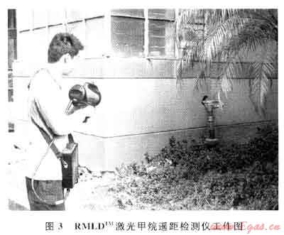 RMLDTM激光甲烷遙距檢測(cè)儀作為便攜式中的領(lǐng)先產(chǎn)品,采用了可調(diào)諧二極管激光吸收(TDLAS)技術(shù),可以調(diào)頻檢測(cè)C0和C02氣體的含量,并且能夠巡檢原來(lái)不能到達(dá)或不易到達(dá)的地方,不必將探頭置于可燃?xì)怏w的環(huán)境中,操作人員不用處于一些危險(xiǎn)的環(huán)境中,提高了工作環(huán)境的安全性,降低了操作人員的勞動(dòng)強(qiáng)度。同時(shí)檢測(cè)儀預(yù)熱時(shí)間短,只需2~3min,且具有自檢和標(biāo)定的功能。RMLDTM激光甲烷遙距檢測(cè)儀工作圖如圖3所示。