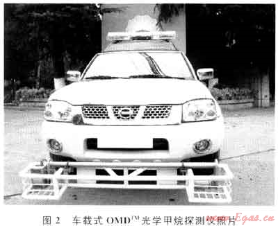 車(chē)載式OMDTM光學(xué)甲烷探測(cè)儀是專門(mén)為埋地天然氣管網(wǎng)及集輸管線設(shè)計(jì)的氣體檢漏裝置,其照片如圖2所示。紅外燈柱探測(cè)器安裝在檢測(cè)車(chē)前,可在各種環(huán)境條件下運(yùn)行,不會(huì)因光柱上的塵土雪水等而引起吸收頻率的微小波動(dòng);檢測(cè)儀響應(yīng)速度快,可檢測(cè)低于1ppm(1ppm=1mg/kg,下同)濃度的甲烷泄漏,速度高達(dá)10000次/s,且穩(wěn)定性好,自身不會(huì)引起檢測(cè)系統(tǒng)發(fā)熱,系統(tǒng)工作穩(wěn)定性好。另外,0MDTM內(nèi)部有刻度校準(zhǔn)器,能夠在任何時(shí)間檢驗(yàn)探測(cè)儀和設(shè)備是否正常運(yùn)行,檢測(cè)數(shù)據(jù)和GPS數(shù)據(jù)通過(guò)端口與PC連接便于數(shù)據(jù)分析與存儲(chǔ)。