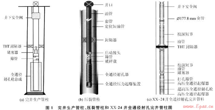 全通徑射孔[1~2]是采用油管將全通徑射孔器材及配套井下工具輸送到目的層位,起爆射孔后,將射孔器材的附件全部丟掉,整個(gè)管柱形成與油管直徑相當(dāng)?shù)耐◤?。它能夠?qū)崿F(xiàn)一次性完井管柱,保護(hù)氣藏免受二次污染;能夠與酸化、加砂壓裂等增產(chǎn)措施聯(lián)作,節(jié)省完井時(shí)間和鉆井費(fèi)用;能夠?yàn)楹罄m(xù)生產(chǎn)測(cè)井提供過儀器通道。