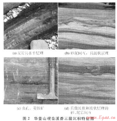 上述特征即使在可能鄰近湖泊邊緣的華鎣山觀音溪露頭剖面上也表現(xiàn)得很清楚。該剖面中的巖層被溪水沖刷得非常干凈,沉積特征十分清楚,香三、香五段以灰黑色泥頁巖為主,夾薄層灰色、灰質(zhì)細(xì)-粉粒砂巖。泥頁巖中水平和微波狀層理非常發(fā)育,其中時夾菱鐵礦條帶或菱鐵礦結(jié)核薄層,上部局部含豐富炭質(zhì)甚至成煤線;粉砂巖具有發(fā)育的波狀層理和豐富的蟲孔,普遍含灰質(zhì),局部成泥灰?guī)r團(tuán)塊或條帶,也夾有菱鐵礦條帶或串珠狀結(jié)核薄層(圖2)。