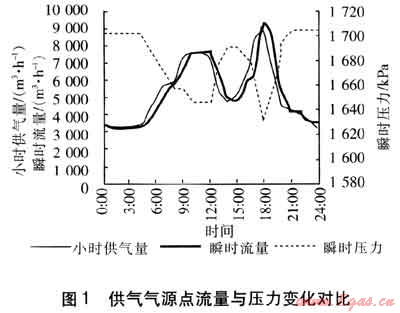 在城市燃?xì)獍l(fā)展到一定規(guī)模,最大小時(shí)用氣量超過管網(wǎng)系統(tǒng)設(shè)計(jì)的小時(shí)供氣量時(shí),中壓管網(wǎng)的壓力波動(dòng)將會(huì)進(jìn)一步加大,中壓管網(wǎng)儲(chǔ)氣用于小時(shí)調(diào)峰在多大程度上能夠滿足管網(wǎng)系統(tǒng)安全可靠地運(yùn)行,就是一個(gè)值得探討的問題。