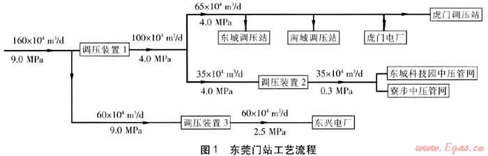 東莞門站工藝流程見圖1。出站的天然氣壓力等級有3種,分別為:①供應(yīng)東城、南城、虎門調(diào)壓站、虎門電廠,處理量為65×104m3/d,由調(diào)壓裝置1實現(xiàn)壓力由9.0MPa降至4.0MPa;②供應(yīng)東城科技園、寮步中壓管網(wǎng),處理量為35×104m3/d,由調(diào)壓裝置2實現(xiàn)壓力由4.0MPa降至0.3MPa;③供應(yīng)東興電廠(每天發(fā)電時間為16h左右),處理量為60×104m3/d,由調(diào)壓裝置3實現(xiàn)壓力由9.0MPa降至2.5MPa。