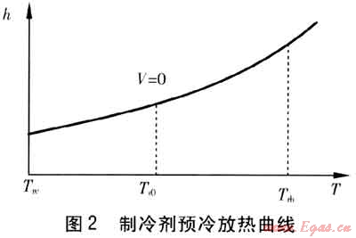 制冷劑預(yù)冷放熱曲線見圖2。與天然氣放熱曲線不同的是,制冷劑預(yù)冷放熱曲線只有一個(gè)拐點(diǎn),在V=0處。因?yàn)闈M足經(jīng)濟(jì)技術(shù)條件的制冷劑必然有必要數(shù)量的重?zé)N,其含量遠(yuǎn)大于天然氣中的重?zé)N含量,故制冷劑在加壓、水冷至常溫后,已處于氣、液兩相狀態(tài),其進(jìn)入冷箱后以潛熱方式放熱,不會(huì)出現(xiàn)V=1的拐點(diǎn)。與天然氣液化放熱曲線一樣,T<Tr0段曲線斜率小于T>Tr0段曲線斜率。