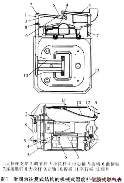 滑閥為往復(fù)式結(jié)構(gòu)的機械式溫度補償膜式燃?xì)獗硎莻鹘y(tǒng)式結(jié)構(gòu),體積較大,見圖1。