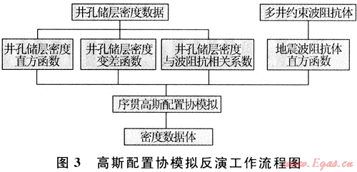 高斯配置協(xié)模擬實(shí)質(zhì)是將地質(zhì)統(tǒng)計(jì)學(xué)理論融入隨機(jī)反演中,隨機(jī)反演在一定地質(zhì)模式指導(dǎo)下進(jìn)行,從而保證反演結(jié)果具有一定的地質(zhì)意義。其具體工作流程(圖3)如下:利用測(cè)井密度曲線與波阻抗反演結(jié)果的相關(guān)性,把約束稀疏脈沖波阻抗反演結(jié)果作為隨機(jī)模擬先驗(yàn)信息,使其成為橫向外推的約束條件,把密度曲線作為第一類數(shù)據(jù),波阻抗結(jié)果作為第二類數(shù)據(jù),通過(guò)對(duì)常規(guī)波阻抗結(jié)果和密度曲線的直方圖、變差函數(shù)分析,用地質(zhì)統(tǒng)計(jì)學(xué)原理反演出第一類數(shù)據(jù),進(jìn)而得到密度的模擬結(jié)果。