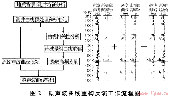 將密度曲線的高頻信息加入到速度曲線的低頻背景中去,得到具有密度信息的偽速度曲線,然后將其與密度曲線乘積,得到擬波阻抗曲線,其流程見(jiàn)圖2。原始波阻抗與密度的相關(guān)系數(shù)為0.63,重構(gòu)后波阻抗與密度的相關(guān)系數(shù)為0.78,重構(gòu)后波阻抗與原始波阻抗的相關(guān)系數(shù)為0.81??梢?jiàn)重構(gòu)后,密度與擬聲波曲線得到的波阻抗相關(guān)性得到了提高。重構(gòu)后的聲波曲線完成的合成記錄與原始合成記錄一致,質(zhì)量更好。